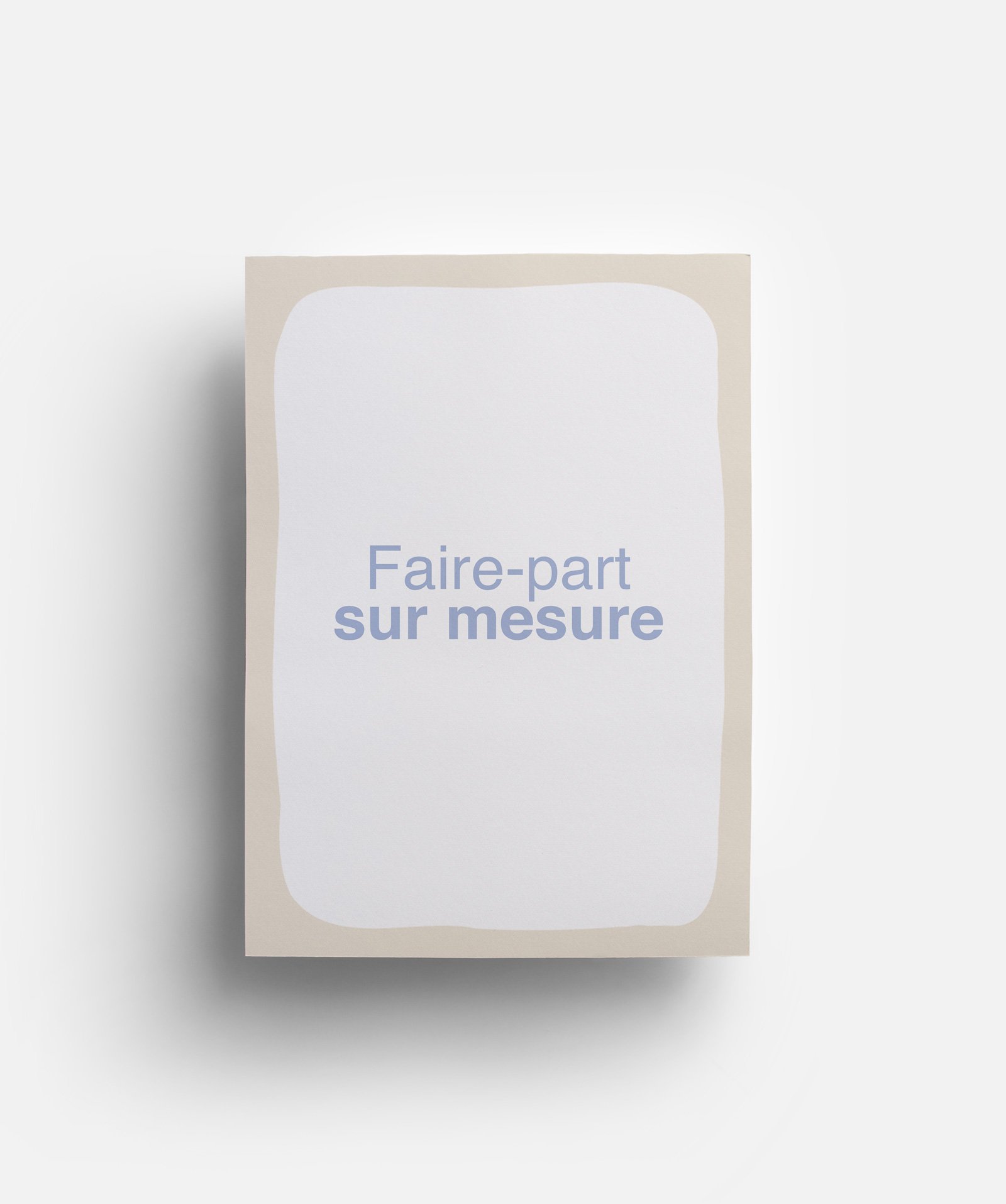 ➤ Vous souhaitez une prestation sur mesure ? Nous pouvons travailler sur toute la papeterie des événements de vos vies : mariage, naissance, remerciement, deuil périnatal, vœux, décès (faire-part, menu, carton réponse, carte de vœux, annonce, plan de table, etc.)